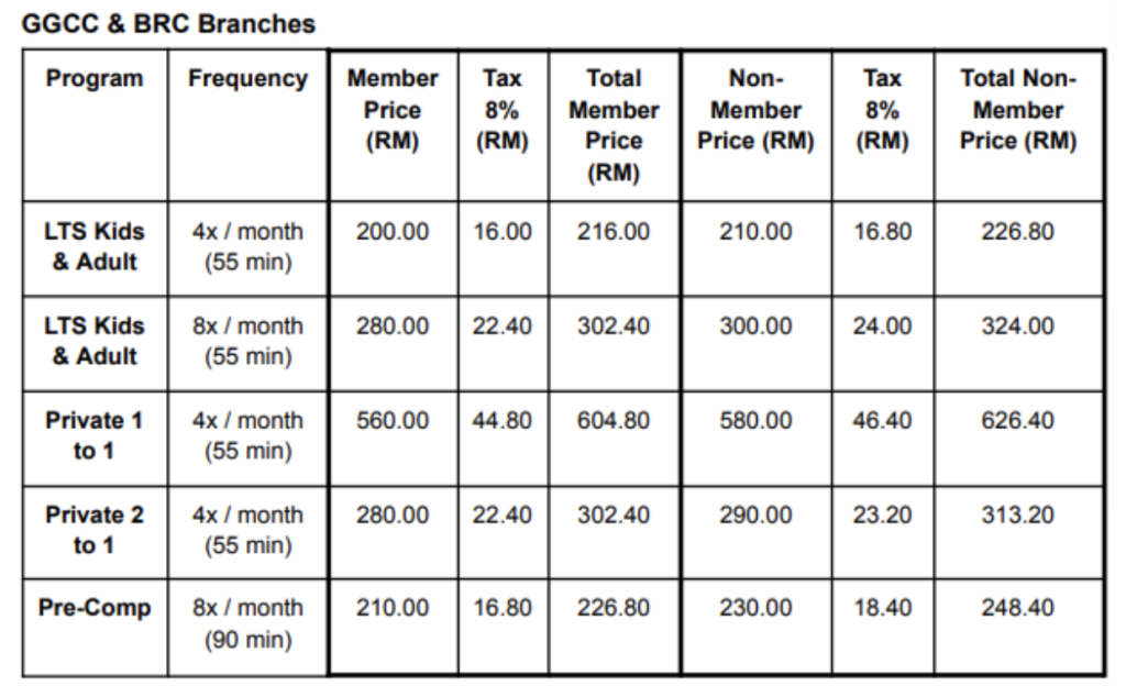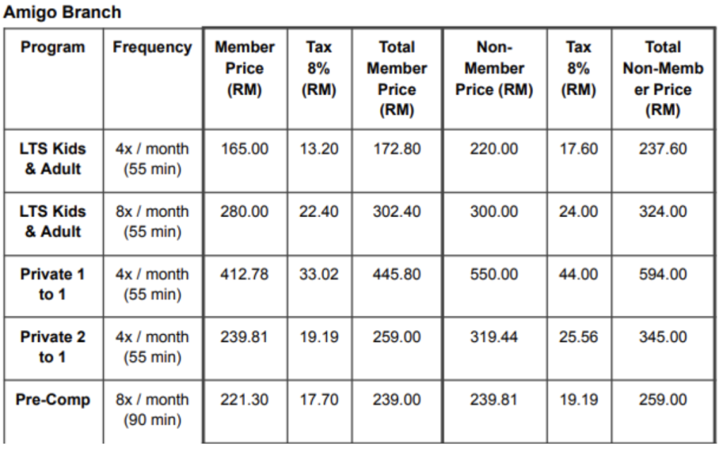- Pre-Competitive (4x/month, 90 mins): RM239.00 (member), RM259.00 (non-member)